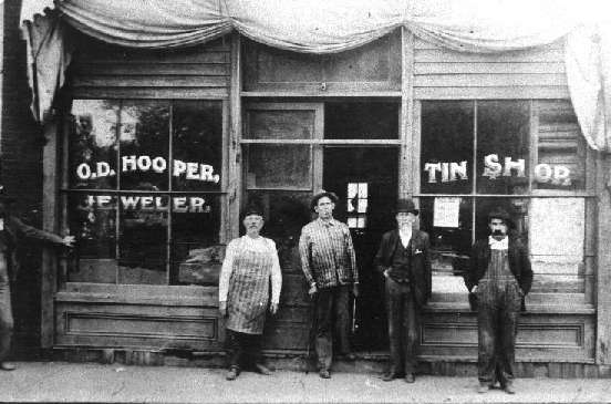Otto Delavan "Bud" Hooper (1870-1951) owned a jewelry & tinsmith shop in Cowden around the turn of the century. This picture is thought to have been taken around 1900-1910. Bud is the one in the picture with the crippled left leg, which was stunted at a young age because of a puncture wound to his hip. The individual to the left of Bud is thought to be Zeke Burrows based on the following paragraph from Orren Jennings Hooper's autobiography. Orren (1904-1988) was Bud's son. Others in the picture are unidentified.