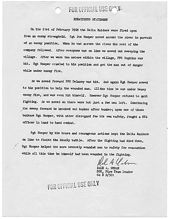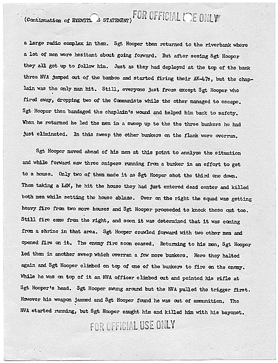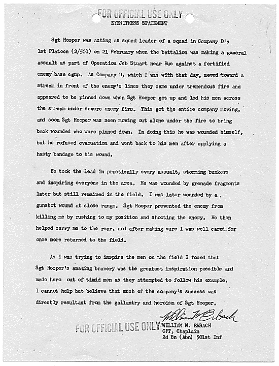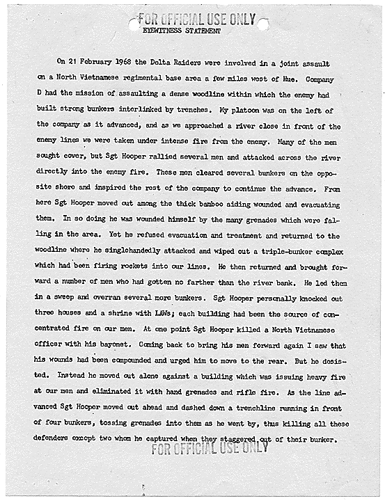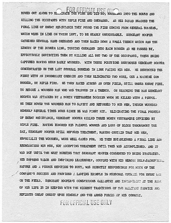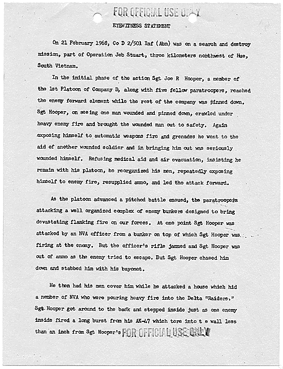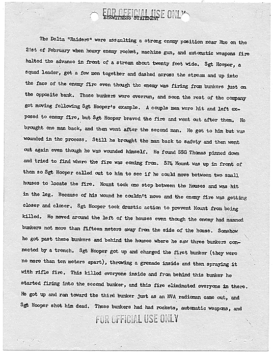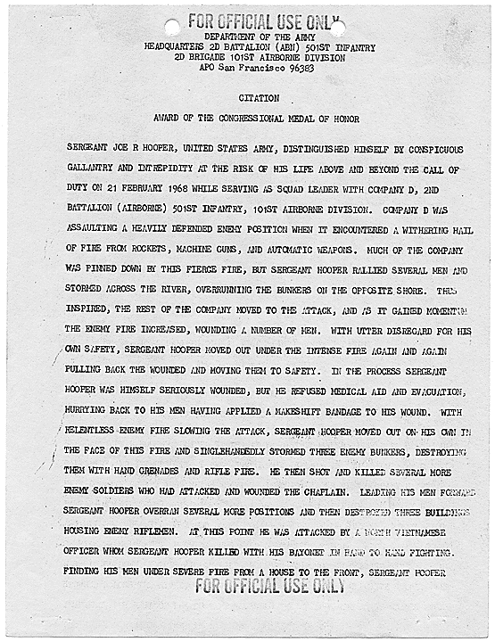 Title: Draft of Citation for Congressional Medal of Honor to be Awarded to Joe R. Hooper, Staff Sergeant, Company D, Second Battalion (Airborne), 501st Infantry, 101st Airborne Division, for actions at the Battle of Hue, 21 February 1968, ca. 03/12/1968
