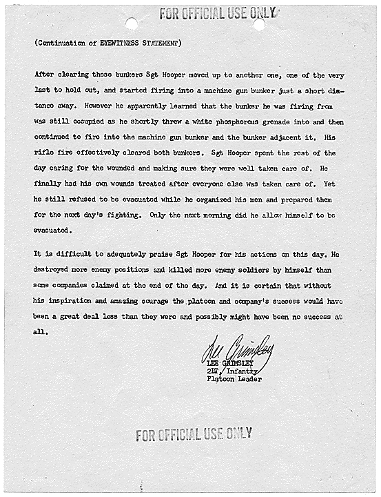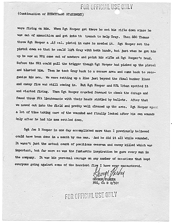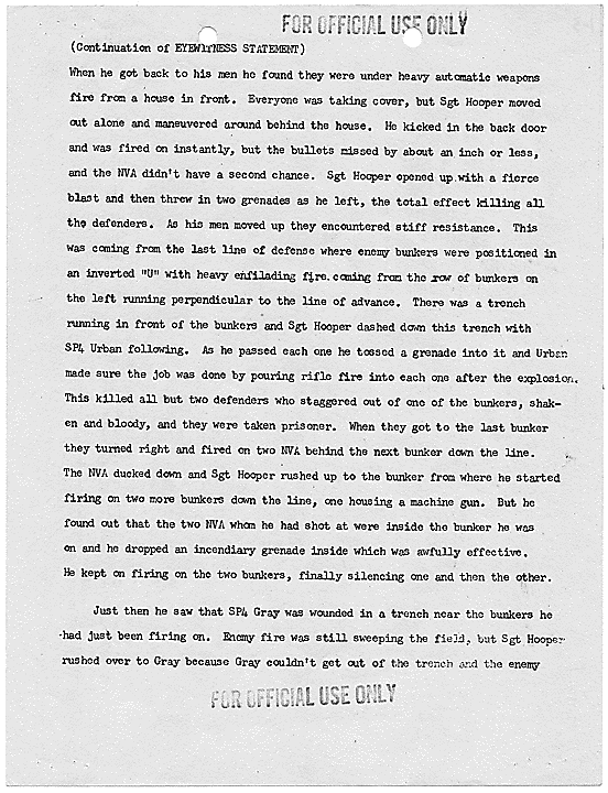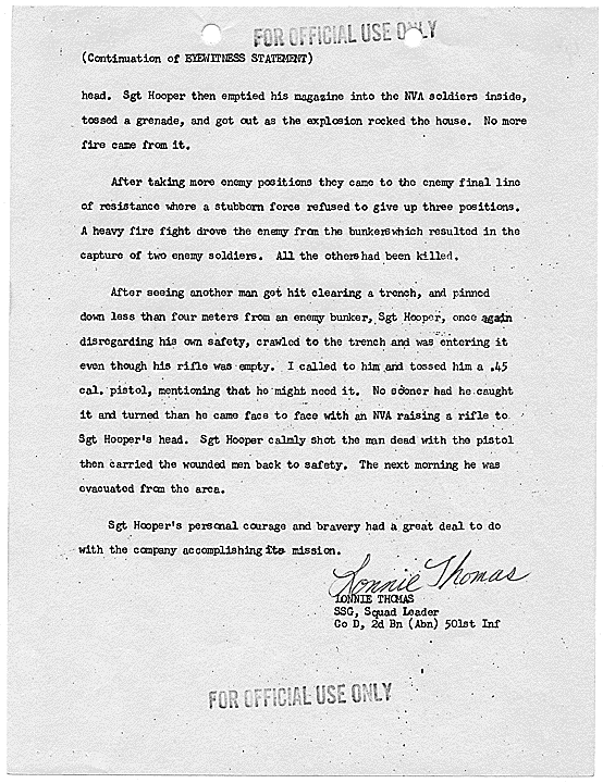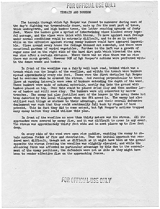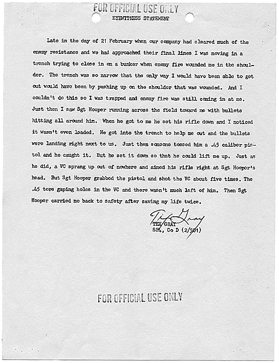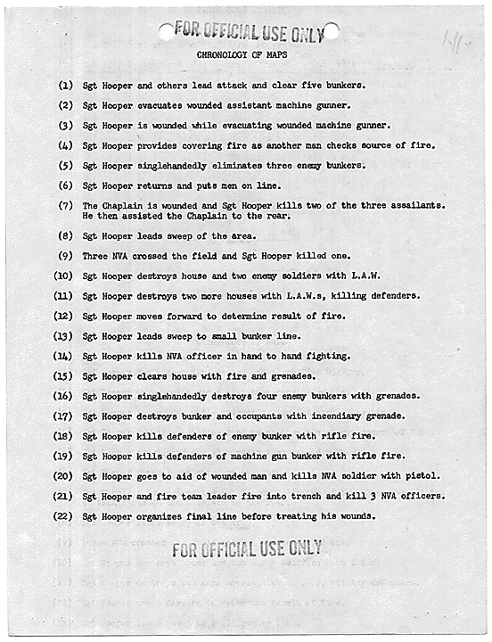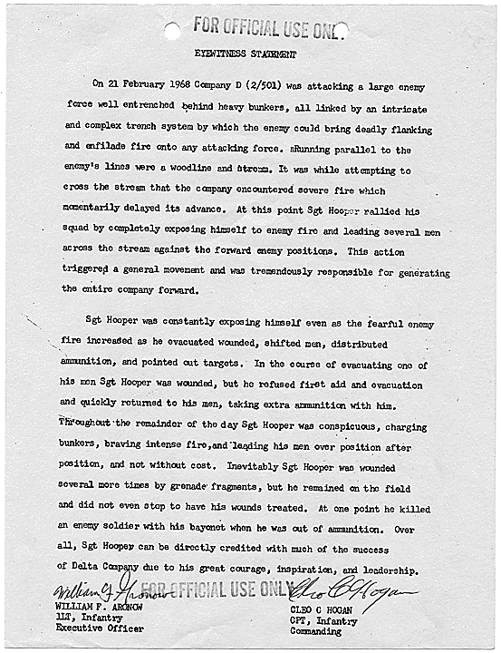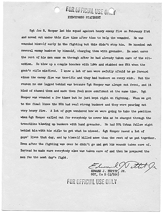 Title: Draft of Citation for Congressional Medal of Honor to be Awarded to Joe R. Hooper, Staff Sergeant, Company D, Second Battalion (Airborne), 501st Infantry, 101st Airborne Division, for actions at the Battle of Hue, 21 February 1968, ca. 03/12/1968