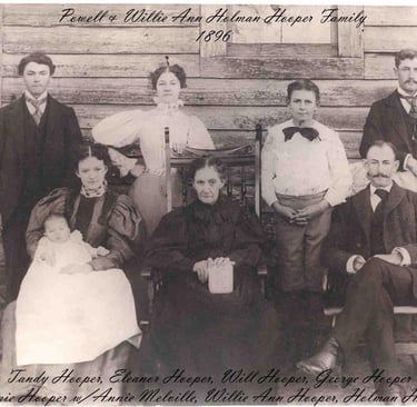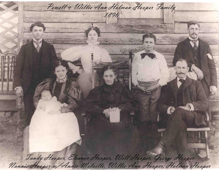 Front Row: Nannie Henrietta Hooper Hooper (Gale's Great Grandmother), Annie Melville Hooper Nashold is the baby (Gale's Grandmother), Wilhelmina "Willie" Ann Holman Hooper (Gale's Great Great Grandmother), and John Holman Hooper (Gale's Great Grandfather)